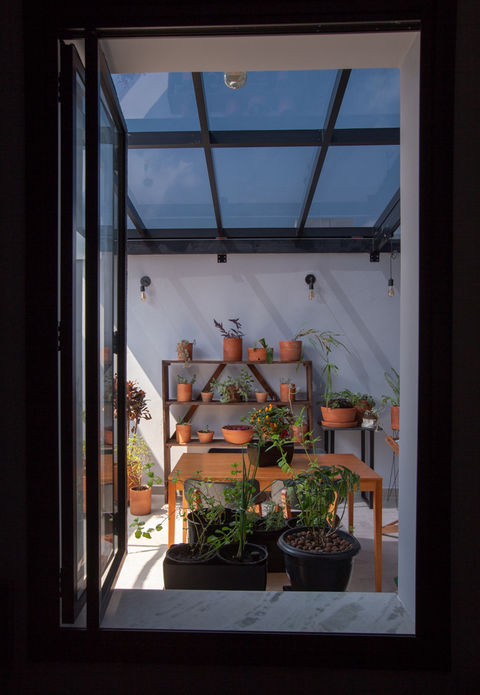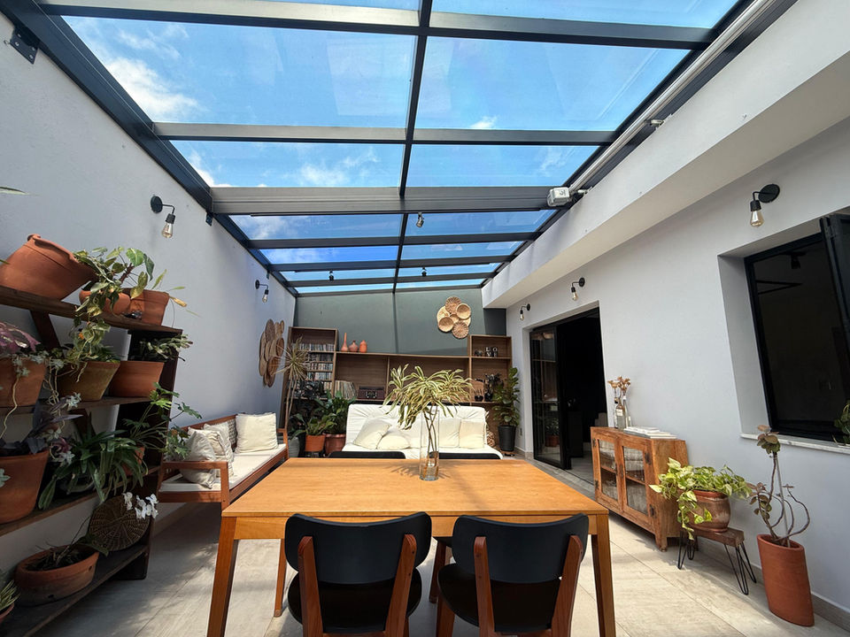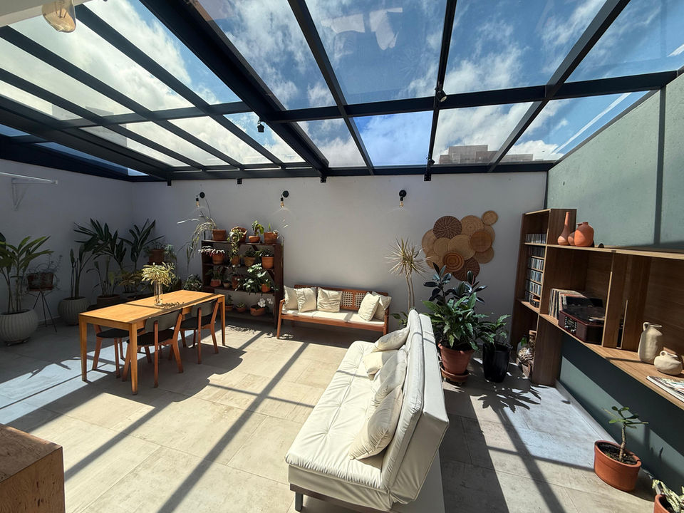 - Solarium Área externa/terraço com teto de vidro, sofá branco, mesa com cadeiras e sofá creme em madeira com corda náutica.. A decoração conta com muitas (muitas mesmo) plantas e luz natural.